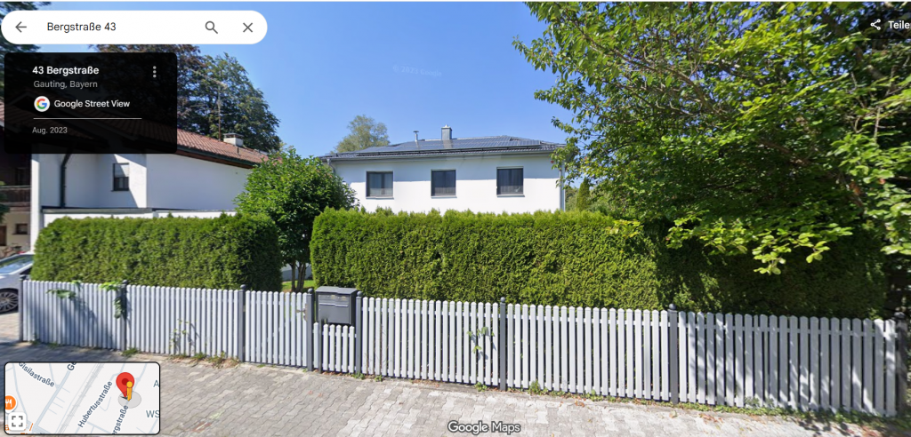 Dabei handelt es sich um die “Bergstraße 43, Gauting” – wo die Familie August 1956 gewohnt hat. Die letzte Adresse, die erfasst ist auf der Karte. Von wann das Haus auf dem Bild genau ist, kann ich nicht sagen. Aber dort auf dem Gründstück haben die 4 gewohnt, vielleicht sogar in diesem kleinen Haus – weg aus der großen Stadt in die Kleinstadt westlich von München (ca. 35min mit dem Auto entfernt) – vielleicht war es ein Neustart, vielleicht suchten sie Ruhe. Wer weiss….