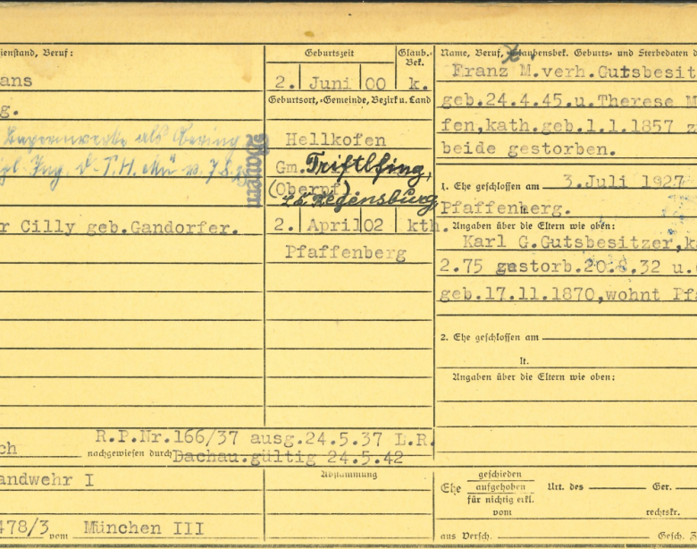 Wir haben also die alte Meldekarte zu Hans und Cilly Meyer (Signatur: DE-1992-EWK65-M377). Dort kann man vieles entnehmen, beispielsweise, wo sie genau wohnten, Kriegsverstrickungen und die Schuld-Entlastung des Mannes, die kompletten Namen der Kinder, die Adresse, wo sie im Anschluss an den Krieg, also nach München gewohnt hatten und vieles mehr. Toll!