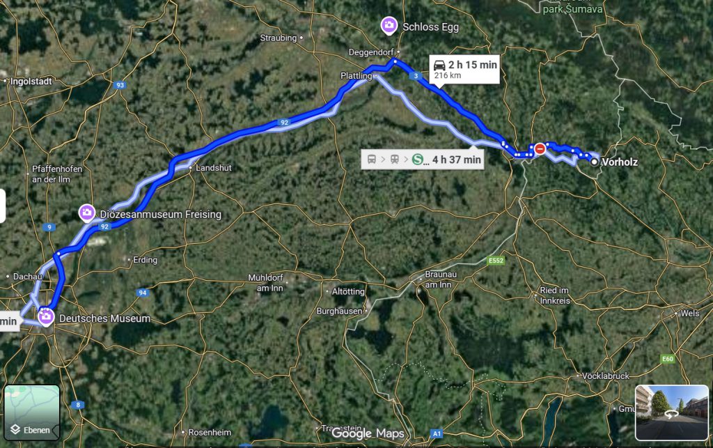 Ich hab euch mal die Strecke von Ursel zu ihrer Freundin Cilly rausgesucht. Nach heutigen Mobilitätsmöglichkeiten: