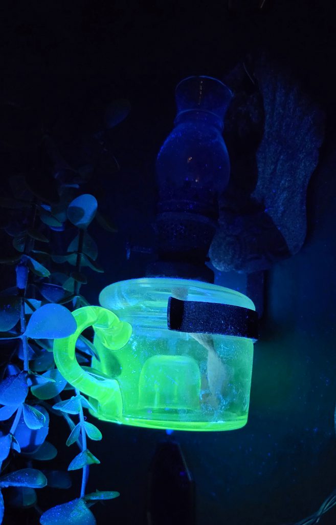 Uranglas (in Kennerkreisen auch als Vaselineglas bezeichnet) ist es, las ich dort. Klar hatte ich bereits von diesem Glas gehört. Ich bin ja viel auf Trödelmärkten unterwegs. Dort sieht man immer mal Vasen, Gläser etc. in einem stechenden Grün, fast Neongrün, und ich hörte, wie man es „Uranglas“ nannte. Dass es aber so derart leuchten kann, das wusste ich nicht.