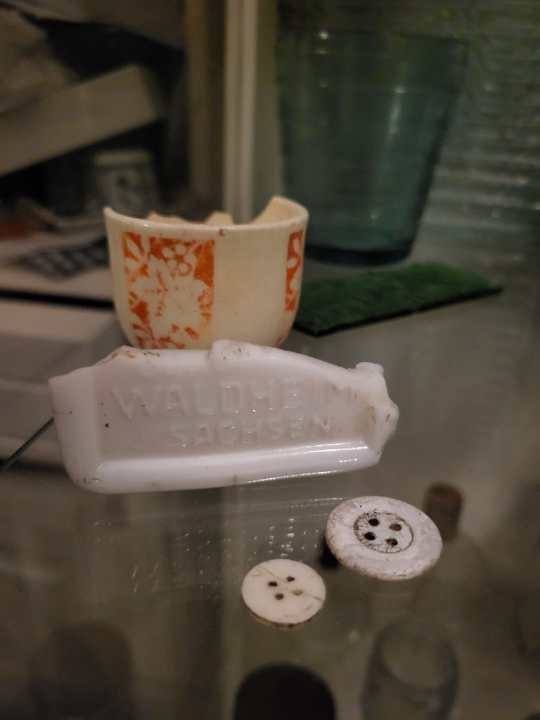 Schmuck habe ich nicht gefunden bisher, allerdings Knöpfe und auch eine Murmel für Kinder, zum Spielen. Den Knopf, der am meisten leuchtet (rechts), den bereits erwähnten Zahnpastabehälter und einen Eierbecher seht ihr unten: