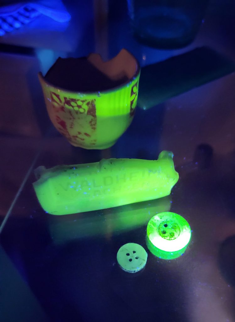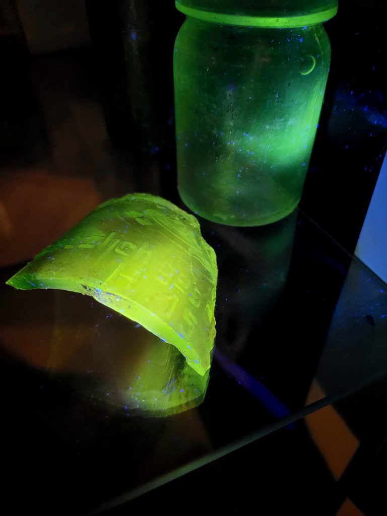 So fragte ich mich, ob auch in meiner Sammlung von Scherben, Glasröhrchen und Flaschen aus dem Wald auch solches Glas zu finden ist. Ich war mir FAST sicher, dass es nicht so wäre, denn so gut wie keines meiner Fundstücke ist grün oder neongrün. Also wenig Grünes überhaupt, höchstens mal was leicht grün Getöntes. Da Uran ja nun verwendet wurde gerade wegen der grünlichen Färbung – Kann also nicht sein!
