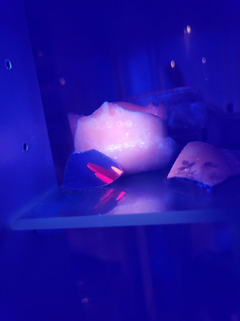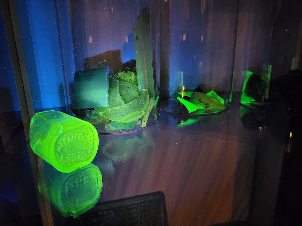 Was ich obendrein noch herausfinden konnte ist, dass vieles in meiner Sammlung Mangan-Glas ist, welches bei 365nm leuchtet, aber nicht bei 395. Manganglas ist nicht radioaktiv, kann aber dank Uran als Verunreinigung im Glas doch wieder leicht radioaktiv sein, aber auch dann meist nur an der Oberfläche und gilt als ungefährlich, noch ungefährlicher als Uranglas. Die Mehrheit des Manganglases ist gar nicht strahlend.