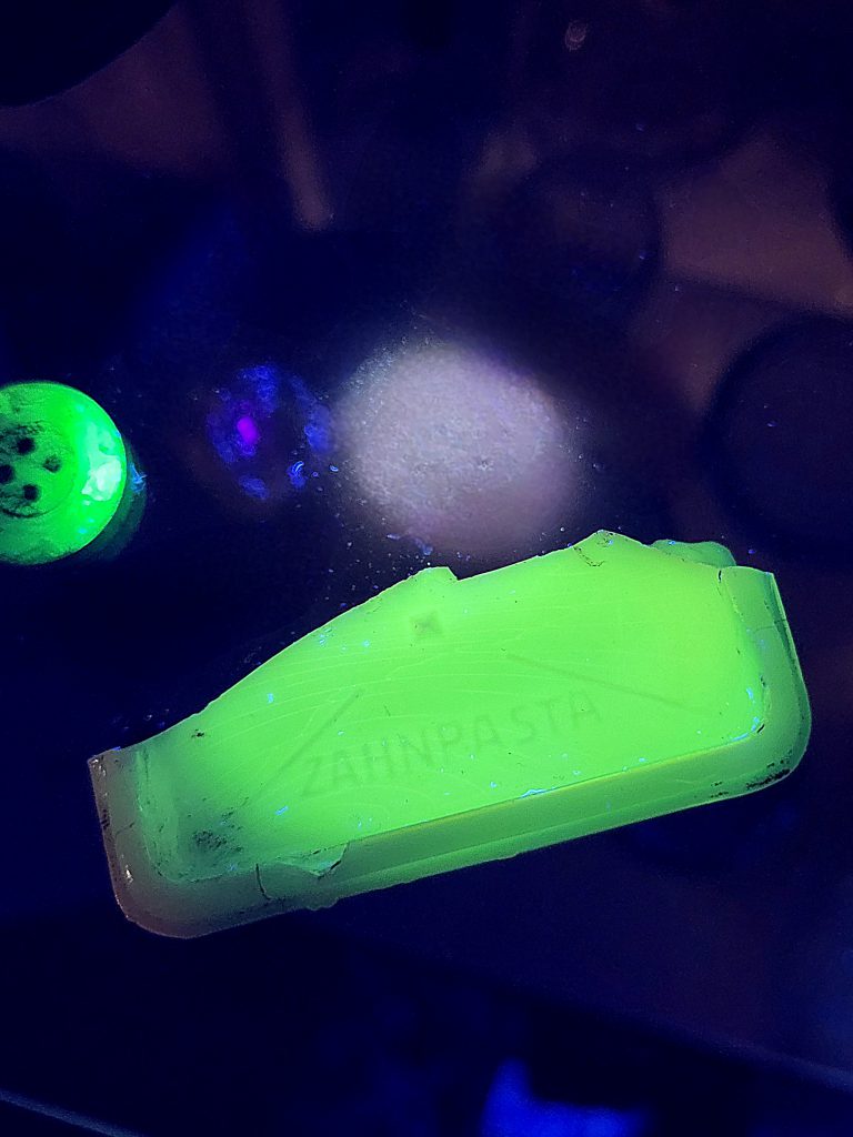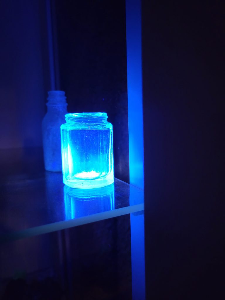 Doch bestellte ich eine Taschenlampe mit einer Wellenlänge von 365nm. Als sie ankam ging ich direkt in mein Schlafzimmer und überall begann es zu leuchten. Ich fasste es nicht!! Komplett durchsichtiges Glas leuchtete giftig neon-grün auf und das überall im Raum. Ein Schock!