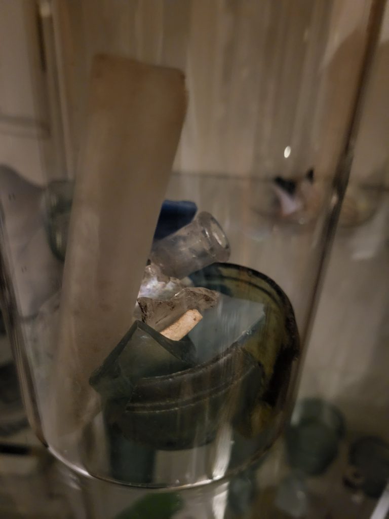 Ganz links seht ihr ein Stück einer Flasche sogenannter Quackmedizin, also solche, die nicht wirklich wirkt, mit der nur Geld gemacht wurde. So haben die Menschen also nicht nur unwirksame “Medizin” zu sich genommen, sondern AUCH NOCH aus Uranglas. Klasse!