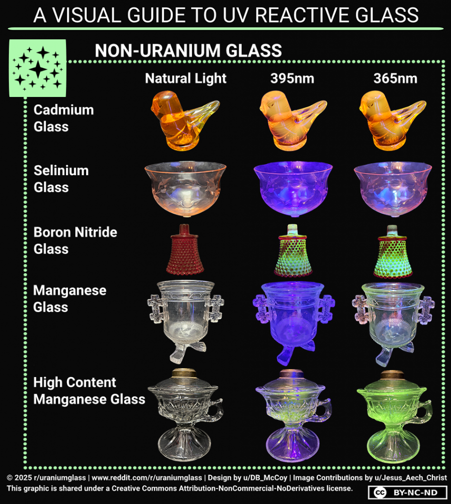 “Ich habe das zusammengestellt, um die verschiedenen Farbtypen und UV-Leuchten beim Durchstöbern von Secondhand-Läden auseinanderzuhalten, aber ich weiß nicht, ob alles stimmt. Korrekturen, bitte! Die Glasfarbe in Großbuchstaben ist die häufigste Farbe. Weniger häufig in Kleinbuchstaben. [Aktualisiert, und wird weiter aktualisiert, wenn neue Infos reinkommen – danke!]“