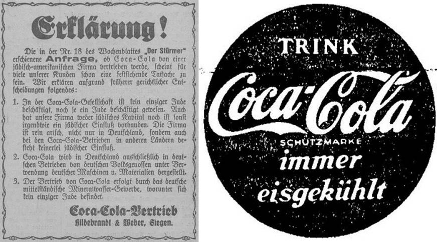 Außerdem sponserte das Unternehmen 1936 die Olympischen Spiele in Berlin, damals wehten Fahnen mit Coca-Cola-Logo unmittelbar neben denen mit Hakenkreuz-Emblem.