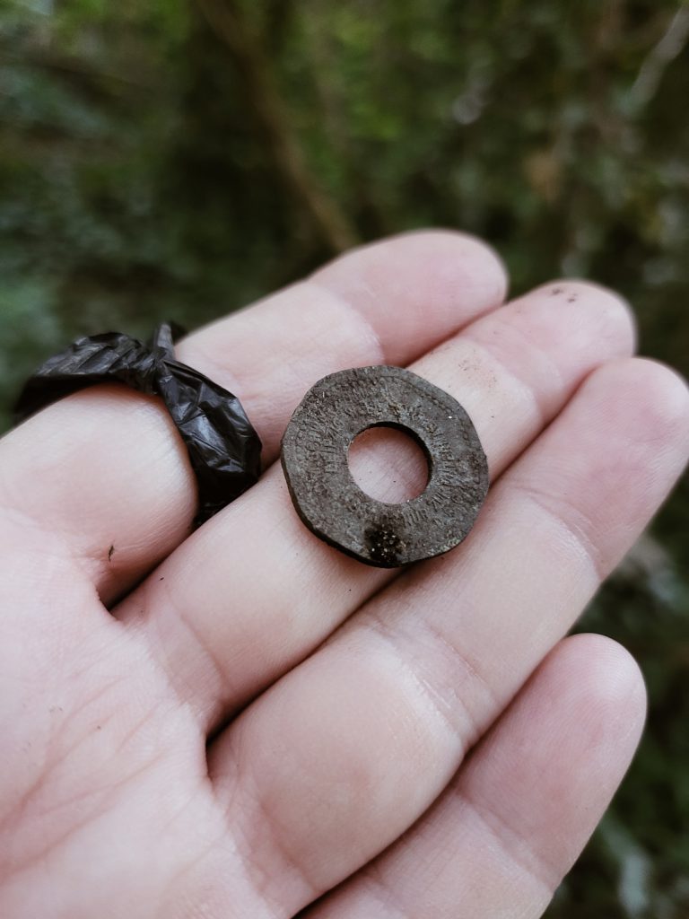 Als ich sie so auf dem Waldboden liegen sah, dachte ich in der ersten Sekunde “eine Unterlegscheibe!!”, dann aber “hmmm…könnte auch eine Münze sein!” Ich hab direkt das Bild geschossen, welches auch oben eingefügt ist. Auf der Aufnahme konnte ich nun bereits Ansätze deutsche Schrift erkennen, besser als auf der kleinen dreckigen Münze selbst.