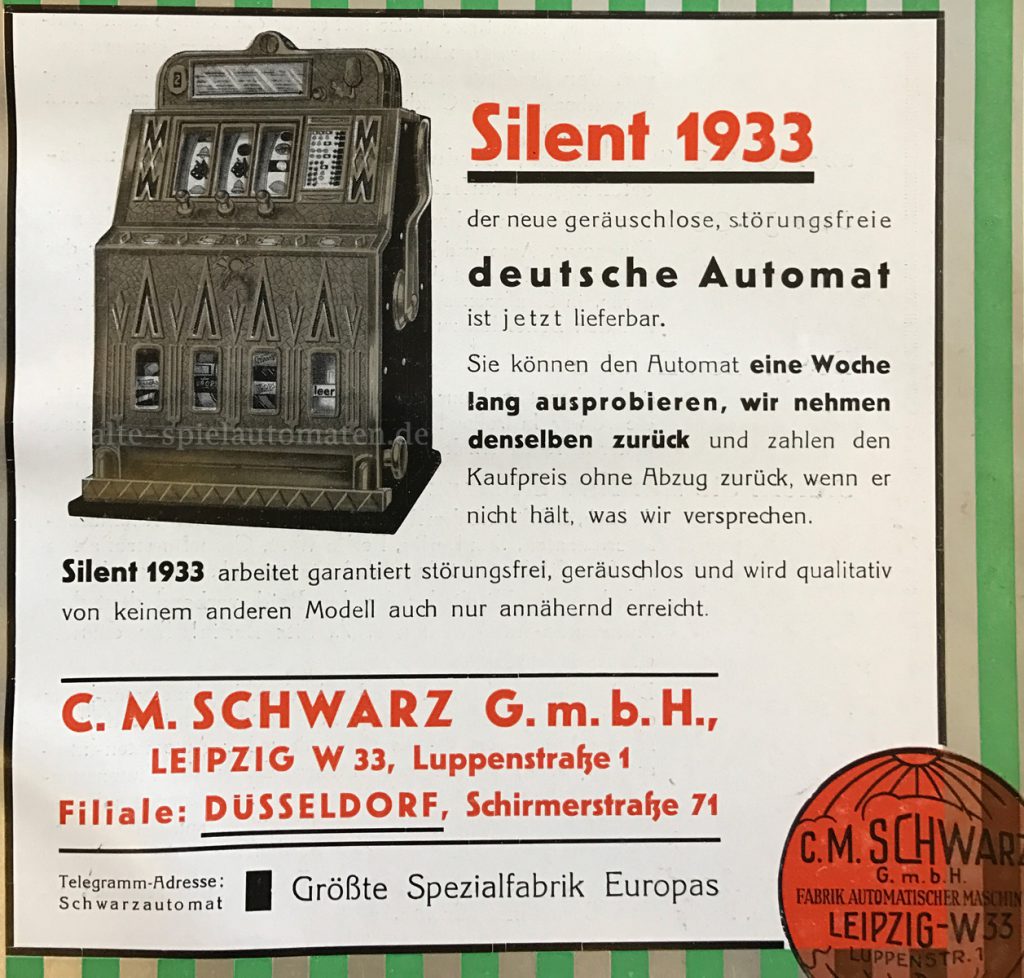 Für uns ist aber die Filiale in Düsseldorf irrelevant. Sie eröffnete erst 1938, wie ihr eben erfahren habt. Da durfte die Münze gar nicht mehr hergestellt werden, da sie bereits verboten war. Düsseldorf war also vermutlich der Versuch einer Expansion der Firma, der nach wenigen Jahren scheiterte. Aber die Adresse in der Luppenstraße in Leipzig war vermutlich die, wo die Spielmünze hergestellt wurde damals. Wofür ist denn nun aber die Münze?? Über Recherchen fand ich den dazu passenden Automaten – es ist der “Silent 1933”.
