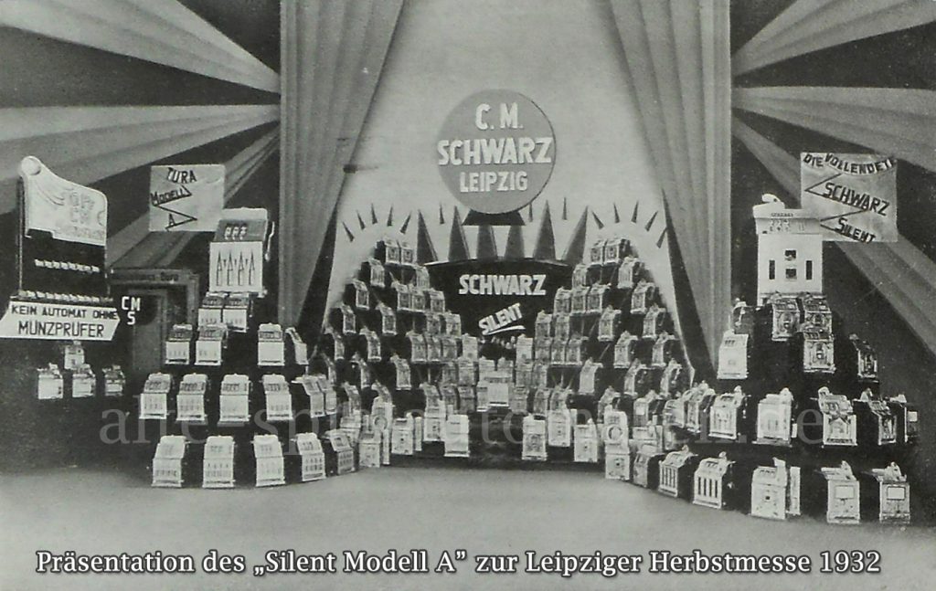 Ahaaaaaa….also ein Spiel- UND Süßigkeitenautomat. Na das kam sicher gut an!! Hier seht ihr ein Bild des Automates und direkt darunter ein Foto der Präsentation des “Silent Modell A” zur Leipziger Herbstmesse (1932).