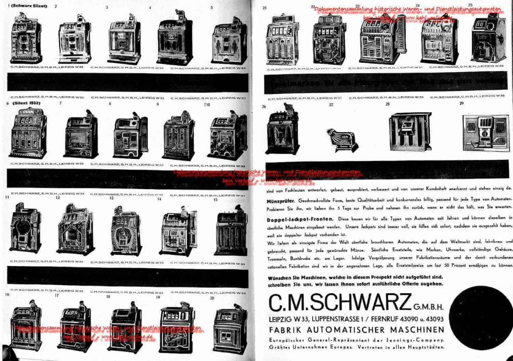 Also 1933 das Aus für die Spielautomaten von Schwarz. Bis dahin gab es verschiedene Modelle, die er designed und vertrieben hatte: