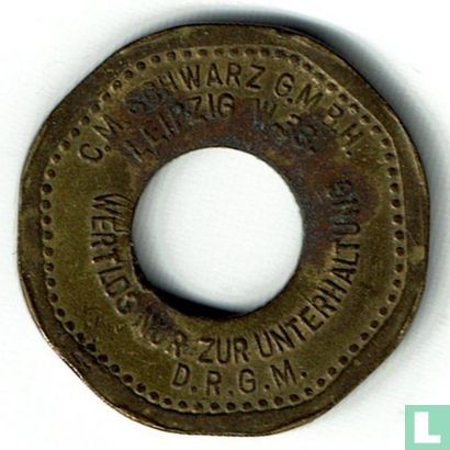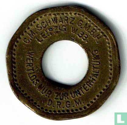 Hier seht ihr das Foto desselben Spieltokens von einem Internetanbieter. Es ist dieselbe Münze, nur besser enthalten, so dass auch dadurch auch die Schrift besser erkennbar ist. Dort können wir also klar lesen: “C.M. SCHWARZ G.M.B.H. – LEIPZIG W33 – WERTLOS NUR ZUR UNTERHALTUNG – D.R.G.M.”