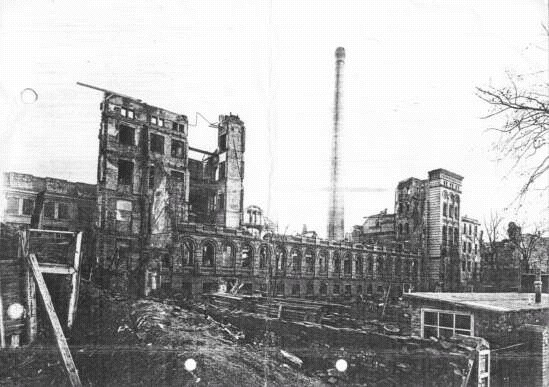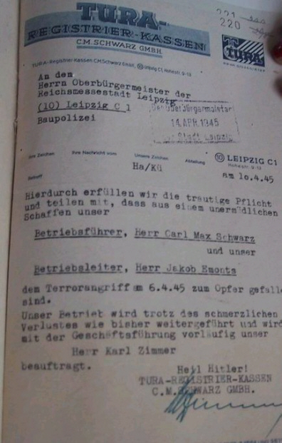 Bei einem der letzten alliierten Bombenangriffe auf Leipzig kommen Tura-Gründer Schwarz und Fabrik-Manager Emonts ums Leben. (vgl. BSG CHEMIE LEIPZIG, 2025) Hier seht ihr die zerstörte Fabrik und drunter ein spannendes Schreiben über das Dahinscheiden des Besitzers und dem Leiter: